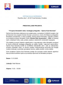 „CLIMAAX – Procjena klimatskih rizika i strategije prilagodbe – Općina Kula Norinska”, koji će se održati u hotelu Narona,